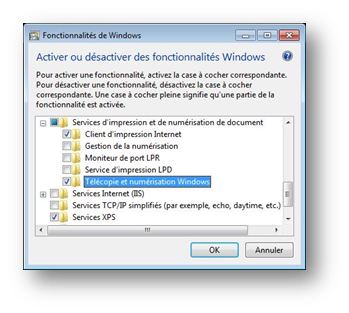 Pour pouvoir envoyer un fax directement depuis WinOptics, il est nécessaire de disposer d'un modem ainsi que d'un gestionnaire de fax. Ce dernier est en général installé en standard avec Windows Seven. Si ce n'est pas le cas, il faut aller dans le Panneau de configuration de Windows, lancer Programmes et cliquer sur le bouton Activer ou Désactiver des fonctionnalités Windows :