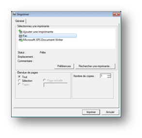 Lorsque le gestionnaire de fax est installé, tout ce qui peut être imprimé peut également être faxé. Il suffit lors de l'impression d'un document de choisir le fax dans la liste des imprimantes :