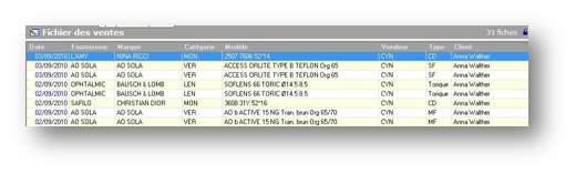 Le classement des ventes est présenté par défaut par ordre inversement chronologique (la plus récente en haut de liste) mais il est possible, comme dans les autres fichiers, d’appliquer un tri personnel (lors de la recherche d’une vente précise, par exemple).