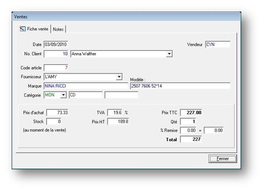La consultation d’une fiche vente se fait en double cliquant sur la vente en question ou en la sélectionnant puis en cliquant sur le bouton Consulter de la barre d’outils :