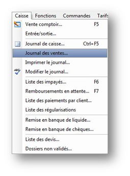 Il est possible d’obtenir une liste des ventes effectuées sur une période donnée ainsi que diverses statistiques depuis le menu Caisse, au point Journal des ventes :