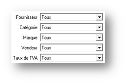 Par défaut, tous les articles vendus pour la période choisie seront listés mais il est possible de ne sélectionner qu'une partie des articles en opérant une sélection sur un fournisseur, une catégorie, une marque, un vendeur ou un taux de TVA :