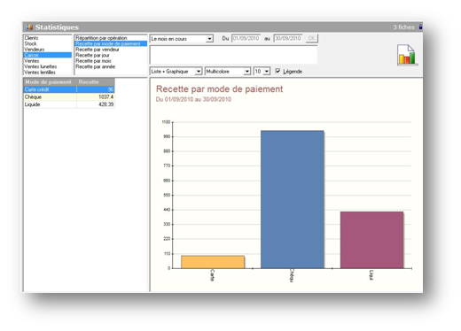 Exemple de présentation du résultat avec liste et graphique, dans le cas de l’analyse des recettes par mode de paiement au niveau de la caisse :