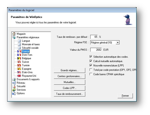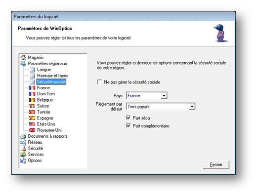 Pour cela, sélectionner le point Options du menu Outils pour accéder à l’écran des paramètres. Y sélectionner l’option Paramètres régionaux/Sécurité Sociale :