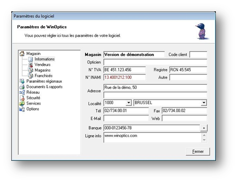 Commencer par sélectionner le point Options du menu Outils pour accéder à l’écran des paramètres. Y sélectionner l’option Magasin/Informations pour renseigner le code INAMI :