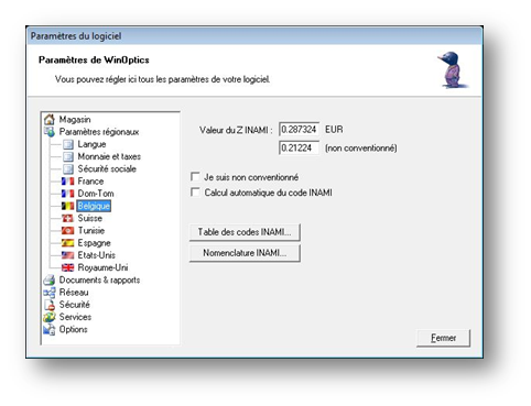 L’option Paramètres régionaux/Belgique permet ensuite de saisir la valeur du Z et d’indiquer si l’opticien est conventionné ou non :
