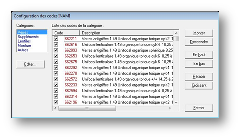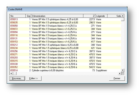 C’est également dans cet écran qu’il est possible de consulter et/ou adapter la table des codes INAMI. Celle-ci est normalement à jour mais il se peut que de nouveaux codes fassent leur apparition avant la prochaine mise à jour du logiciel. Dans ce cas il est possible de les ajouter à la liste existante en utilisant le bouton Table des codes INAMI pour faire apparaître la liste :