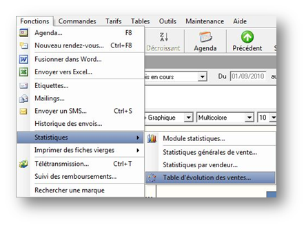 Cette option permet d’avoir un aperçu chiffré et complet de l'évolution des ventes entre deux années distinctes. Pour ce faire, il faut bien entendu disposer de données pour les années choisies. C'est donc une fonction qui n’est pas utilisée dès la mise en place de WinOptics mais qui se révélera précieuse au fil des années. Pour l'utiliser, aller dans le menu Fonctions et sélectionner la rubrique Table d'évolution des ventes de l’option Statistiques :
