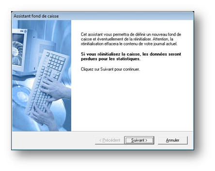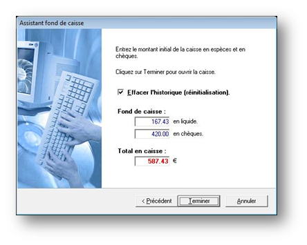 Cet assistant permet de préciser le montant initial de la caisse, en argent liquide et en chèques.