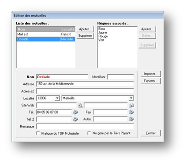 Contrairement aux tables précédentes (concernant les codes LPP, grands régimes, etc.), la liste des mutuelles doit être définie par les soins de l’utilisateur en fonction des accords de tiers payant passés pour le magasin. Pour chaque mutuelle avec laquelle un accord a été passé, il est nécessaire de saisir les coordonnées de la mutuelle et de définir la liste des régimes attachés.