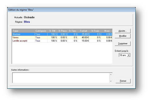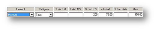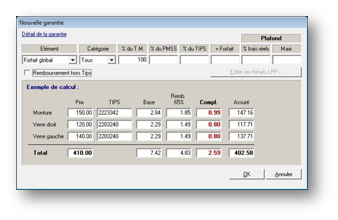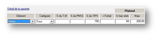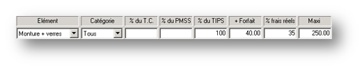 Exemple : Un forfait « monture+verres » auquel s’ajoute 25% des frais réels de la monture. Dans ce cas il est possible de définir une garantie Monture+verres et une autre garantie Monture spécifiant 25% des frais réels.