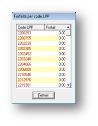 Lorsque l’élément sélectionné dans la liste est «Forfaits par LPP », les champs précédemment expliqués ne sont pas accessibles mais il est possible d’attribuer un montant fixe de remboursement pour chaque code LPP.