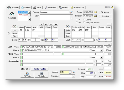 Suite à la saisie des dioptries, il reste à spécifier les articles achetés par le client lors de sa visite, le plus généralement une monture et deux verres.