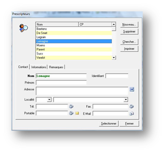 Il est possible à ce niveau de compléter la fiche du prescripteur avec différentes données le concernant (numéro d’identifiant, adresse, domaine d’activité, etc.) Ce fichier pourra être utilisé par la suite par les requêtes ou pour différentes statistiques.