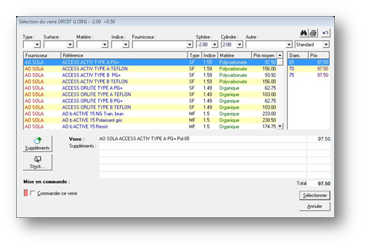Remarque : L’écran de sélection de verre (appelé par la touche F12) est extrêmement utile lorsqu’il s’agit de faire une offre de prix au client. Il propose en effet tous les verres qui peuvent lui convenir en fonction des paramètres indiqués. Ce système offre ainsi une aide à la vente des plus efficaces, il permet également d'inscrire les articles dans le fichier de commande. Se référer au paragraphe « X-B-Tarifs verres » pour apprendre comment ajouter des références de verres et pour de plus amples informations sur l'utilisation de cet écran de sélection.