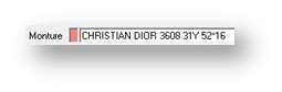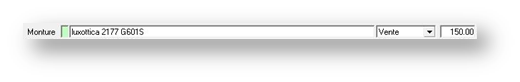 - Inscrire le code de la monture ou de l'accessoire et appuyer sur la touche Entrée : le code sera remplacé par le libellé correspondant et le prix est indiqué s'il est connu (c'est-à-dire s'il a été saisi dans la fiche de stock). C'est généralement la manière la plus rapide et la plus efficace de procéder (d’autant que le code est indiqué sur l'étiquette de l’article).