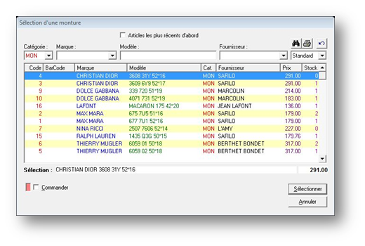 - Utiliser la touche F12 (ou double-cliquer dans l'une des cases montures ou accessoires) pour appeler l’écran de sélection. Cet écran propose le même principe que pour la sélection d’un verre. Toutefois, il est ici plus destiné à rechercher un article dont le code est inconnu qu’à aider le client dans son choix :