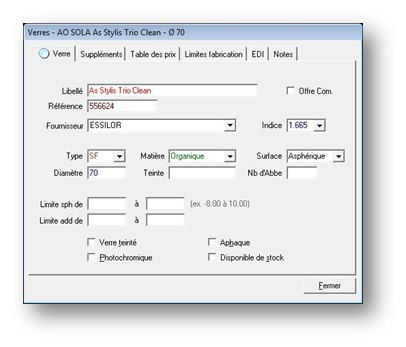 Pour qu’un verre soit correctement sélectionné lors de la vente, les champs Libellé, Référence, Fournisseur, Type, Matière, Diamètre et Indice doivent être renseignés.