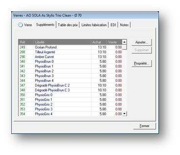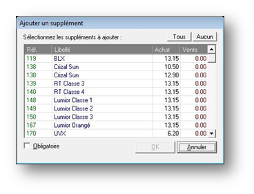 - L’onglet Suppléments permet de faire apparaître la liste des traitements et suppléments disponibles pour le verre sélectionné :