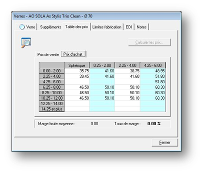 Ainsi dans l’exemple ci-dessus, un verre de correction sphère (+7.00) et cylindre (+1.00) aura pour prix d’achat 50.10 €.