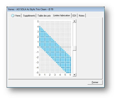 - L’onglet Limites de fabrication permet de connaitre les limites de fabrication du verre. Sur l’axe verticale se trouvent les données sphériques et sur l’axe horizontale les données cylindriques :