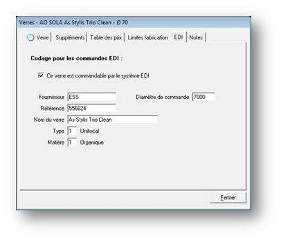 - L’onglet EDI permet de consulter les codes utilisés pour la commande du verre par EDI :