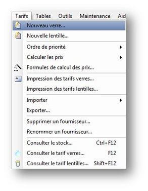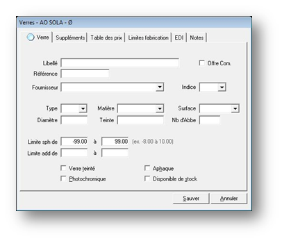 Astuce : Si plusieurs références de verres semblables doivent être saisies, il est possible d’utiliser l’option Dupliquer dans le menu Edition pour créer la copie d'un verre existant et ensuite changer les références ou les prix.