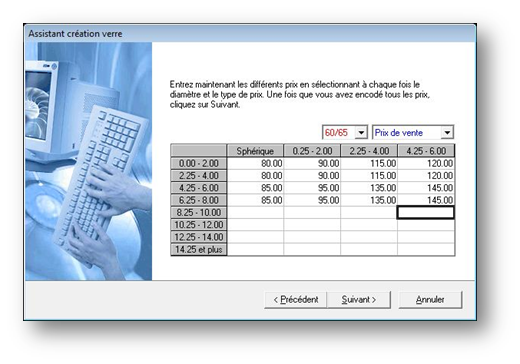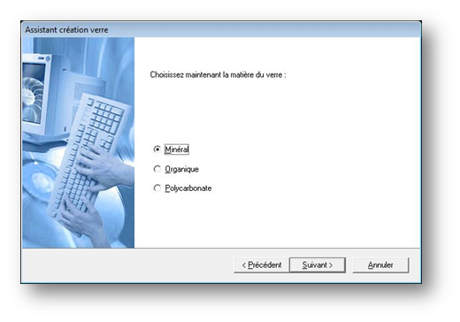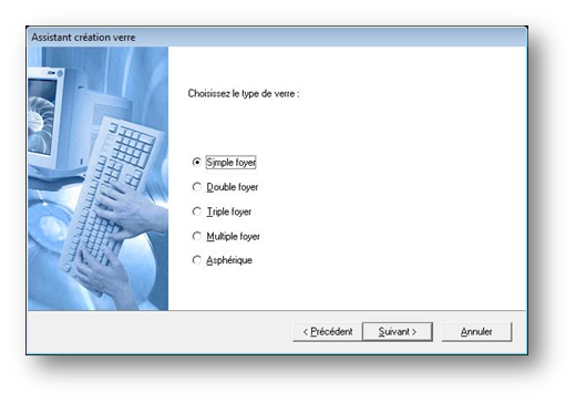 Il existe toutefois une alternative plus rapide, l’assistant de création de verres, accessible en sélectionnant l’option Nouveau verre du menu Tarifs. Dans ce cas, il suffit de répondre aux questions posées par l’assistant après quoi les verres créés seront ajoutés au tarif.