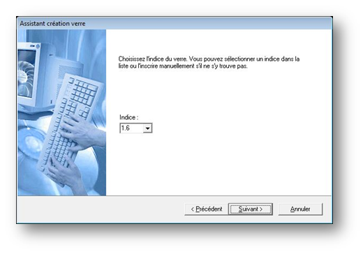 L’étape d’après permet de saisir l'indice du verre en le sélectionnant parmi la liste :