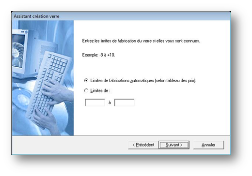 Il reste encore à préciser les limites de fabrication. Ces limites serviront à exclure les verres non réalisables pour la puissance du client. Si les limites ne sont pas connues, il est possible de laisser la sélection par défaut (définie en fonctions des prix) :