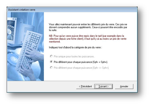 Ensuite il faut indiquer si les prix sont différents pour chaque puissance ou si le tarif est unique pour le verre (ce qui accélèrera la saisie des prix).