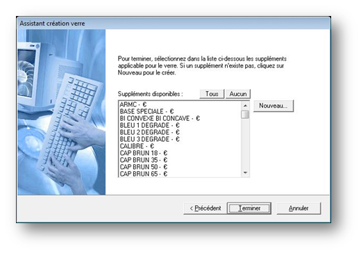 Cliquer ensuite sur le bouton Terminer pour que les verres saisis soient ajoutés au tarif.