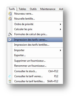 Pour imprimer le tarif d'un verre, d'un fournisseur ou même tous les tarifs en une fois, sélectionner l’option Impression des tarifs verres du menu Tarifs. L’assistant correspondant va se lancer pour sélectionner les tarifs à imprimer :