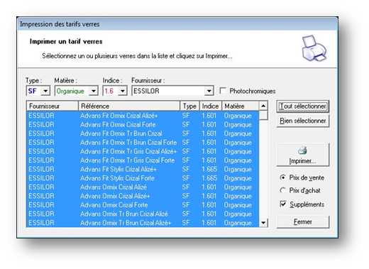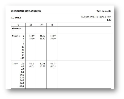 Il peut être intéressant d'avoir une copie papier des tarifs (ne serait-ce que pour faire face à une coupure d’électricité momentanée dans le magasin). WinOptics offre la possibilité d'imprimer les tarifs de manière très professionnelle.