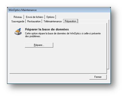 L’onglet Réparation permet de réparer la base de données de WinOptics si celle-ci présente des problèmes (messages d’erreur au lancement de l’application ou impossibilité d’accéder à certains fichiers, par exemple). Ce genre d’erreur est plutôt rare mais peut arriver suite à une panne de courant ou un arrêt brutal de la machine.