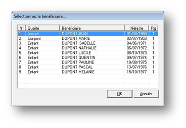 Cliquer simplement sur cette icône (ou utiliser la touche de fonction F12) pour lancer la lecture de la carte. La liste des bénéficiaires apparaît alors :