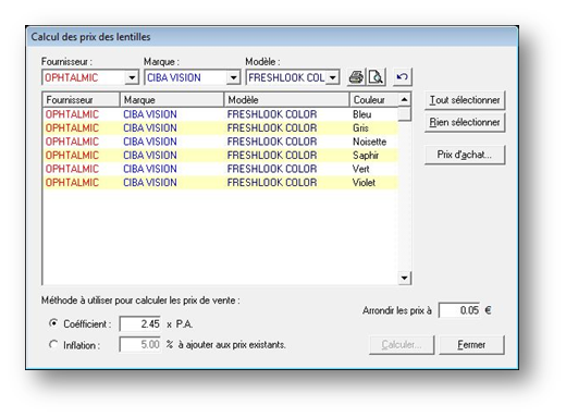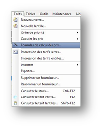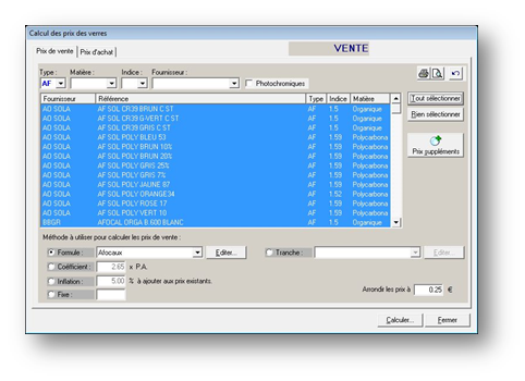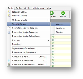 La façon la plus rapide d’effectuer le calcul des prix de vente, que ce soit pour les verres ou les lentilles (de même pour le stock), est d’utiliser l’option Calculer les prix du menu Tarifs :