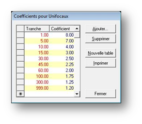 L’écran suivant apparaît, qui permet de créer les différentes tranches de prix d’achat et de saisir le coefficient associé à chaque tranche :