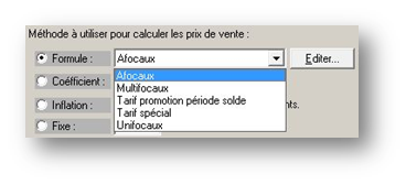 Un écran de sélection (dans le fichier choisi) apparaît proposant différentes méthodes de calcul des prix de vente des articles sélectionnés.