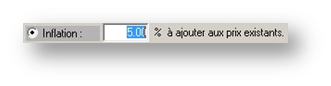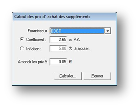 Le bouton Prix Suppléments permet de faire apparaître un écran de modification des prix sur lequel seules sont possibles l’application d’un coefficient et l’application d’un pourcentage d’inflation :