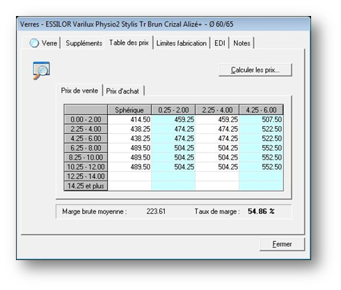Le prix de vente est calculé en fonction du prix d’achat, d’un coefficient et d’une main d’œuvre. La main d’œuvre étant elle-même calculée en fonction des temps de montage pour chaque correction du verre.