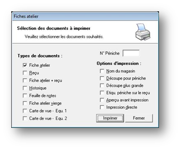 Une fois la fiche complétée, que la vente soit validée ou non, il est possible d'imprimer la fiche atelier correspondante ainsi que d'autres documents utiles. Cliquer pour cela sur le bouton Atelier ou appuyer sur la touche de fonction F6 pour obtenir l’écran de sélection suivant :