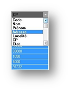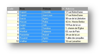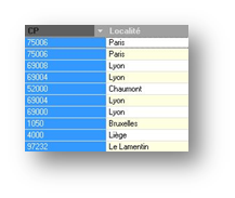 Il est très facilement possible de trier un fichier selon les critères de son choix. Par exemple, pour trier le fichier des fournisseurs par codes postaux, il suffit de sélectionner la colonne CP en cliquant avec le bouton gauche sur l'en-tête de celle-ci (la colonne doit se mettre en surbrillance) :
