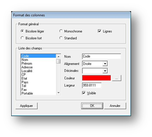 L’écran de format des colonnes apparaît, dans lequel il va être possible de déterminer, pour chaque colonne (définie par le nom du champ correspondant), le format souhaité.