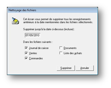 Cette fonction permet de supprimer automatiquement une partie des données antérieures à une date spécifiée. Cette commande n’est à utiliser que si la place manque sur le disque dur ou que le logiciel devient trop lent. Avec la puissance des ordinateurs actuels, il y a peu de chance que cela arrive et donc en principe cette fonction n’a pas lieu d’être utilisée.