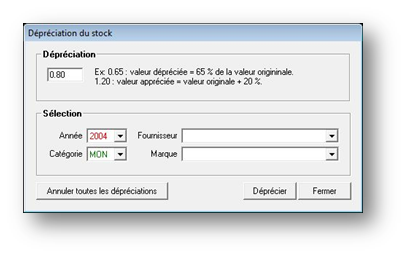 Cette option permet de déprécier la valeur d'un groupe d'articles en modifiant leur prix d'achat. Le prix d’achat d’origine étant conservé dans le fichier, il est possible à tout moment d’annuler une dépréciation.
