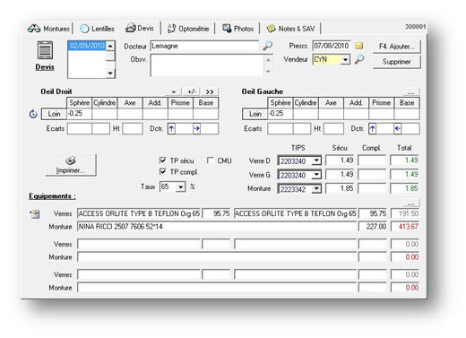L’onglet devis permet de saisir un devis optique présentant jusqu’à 3 choix de verres ou montures. L’écran des devis présente de nombreuses similitudes, quant aux champs à compléter, avec celui des montures :