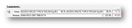 Dans la partie équipements, la sélection des verres et des montures se fait de la même façon que dans la fiche monture. Utiliser la touche F12 pour accéder à la liste des montures ou le tarif verres. Le report des références sélectionnées est automatique :