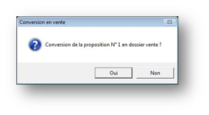 Une confirmation est demandée avant la conversion effective du devis en vente, rappelant le numéro de la proposition à convertir :