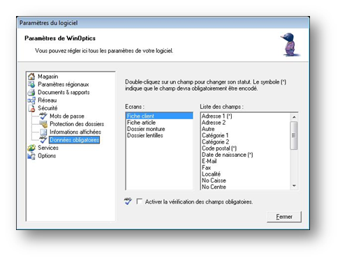 Dans différents écrans de saisis (à sélectionner dans la liste de gauche), il est possible de rendre obligatoire la saisie de certains champs. Pour cela, il suffit de double cliquer sur le champ souhaité et un astérisque apparaît à la suite de ce champ :